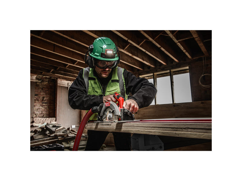 - Hořčíková základna kompatibilní s vodicími lištami MILWAUKEE®. To umožňuje uživateli provádět rovné a přesné řezy v deskových materiálech a zároveň zachovat stejnou řeznou linii při jakémkoli úhlu, čímž se minimalizuje čas nastavení
