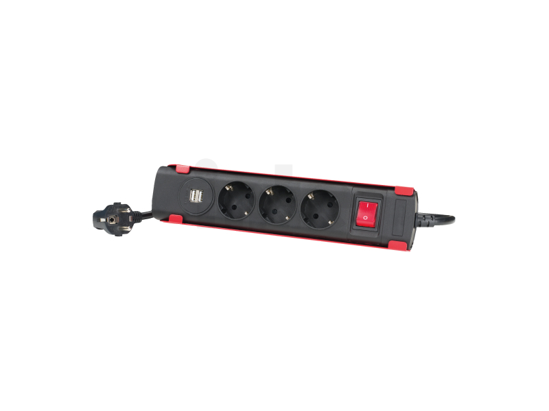 - Zásuvková lišta s 3x zásuvkami pro zástrčku EU nebo UK a 2x zásuvkami USB-A (verze UK 3x USB-A)