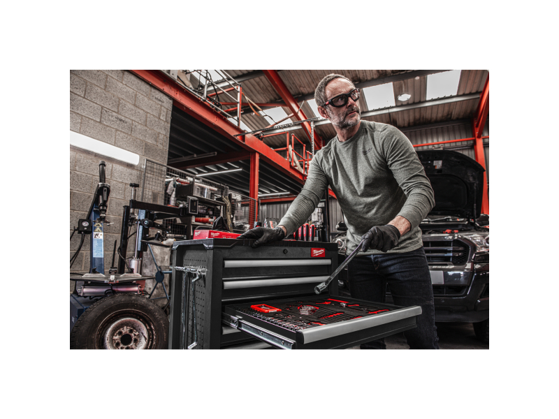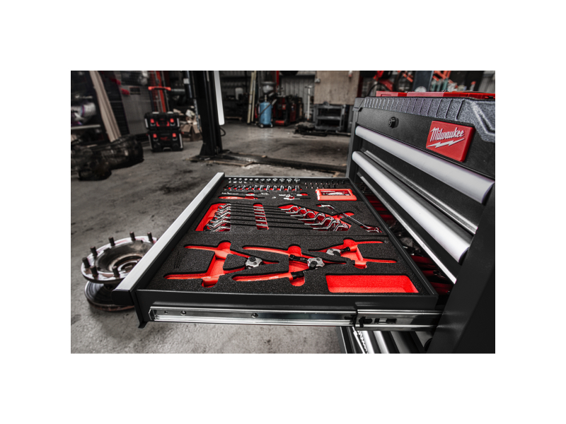 • Zapuštěná pracovní deska z ABS s otvory pro šroubováky a dalšími přihrádkami